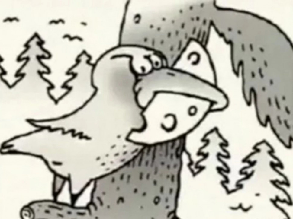 Црно-бела илустрације приказује птицу на грани дрвета, која у устима држи свој плен - комад сира. Али, ако илустрацију погледате из другог угла - уочићете потпуно другу животињу.