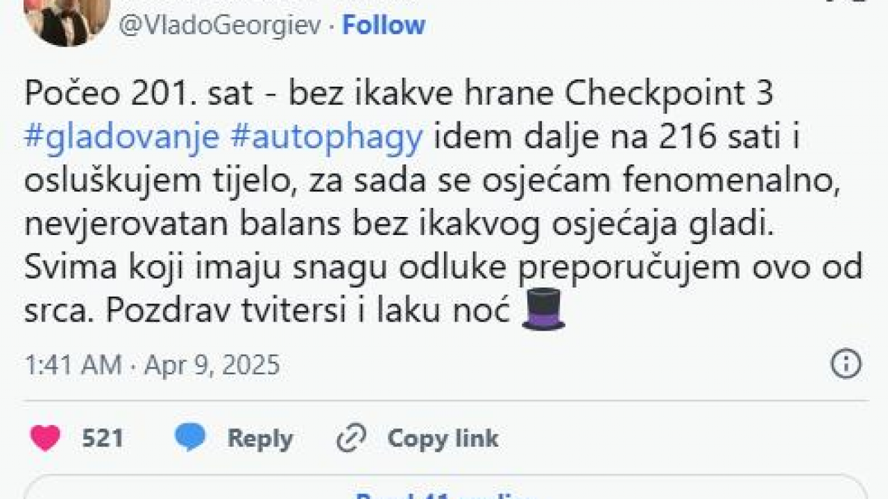 - За сада се осећам феноменално, невероватан баланс без икаквог осећаја глади. Свима који имају снагу одлуке препоручујем ово од срца - написао је Георгиев на X.