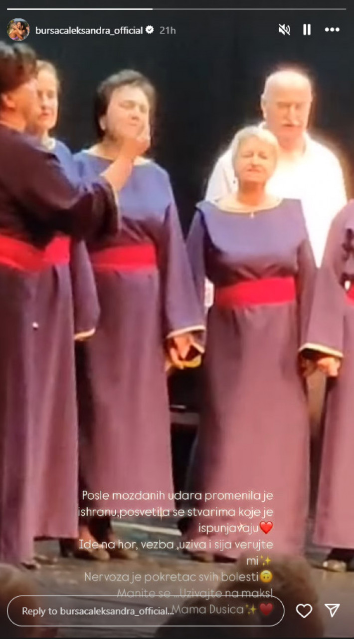 – После можданих удара променила је исхрану, посветила се стварима које је испуњавају. Иде на хор, вежба, ужива и сија, верујте ми - написала је Александра и додала да је њена мајка пронашла мир и срећу у малим стварима.