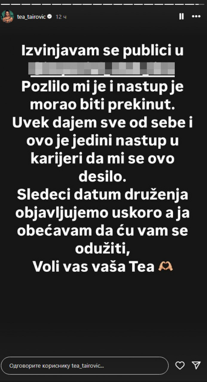 - Извињавам се публици у Линцу. Позлило ми је и наступ је морао бити прекинут. Увек дајем све од себе и ово је једини наступ у каријери да ми се ово десило. Следећи датум дружења објављујемо ускоро, а ја обећавам да ћу вам се одужити. Воли вас ваша Теа - поручила је певачица.