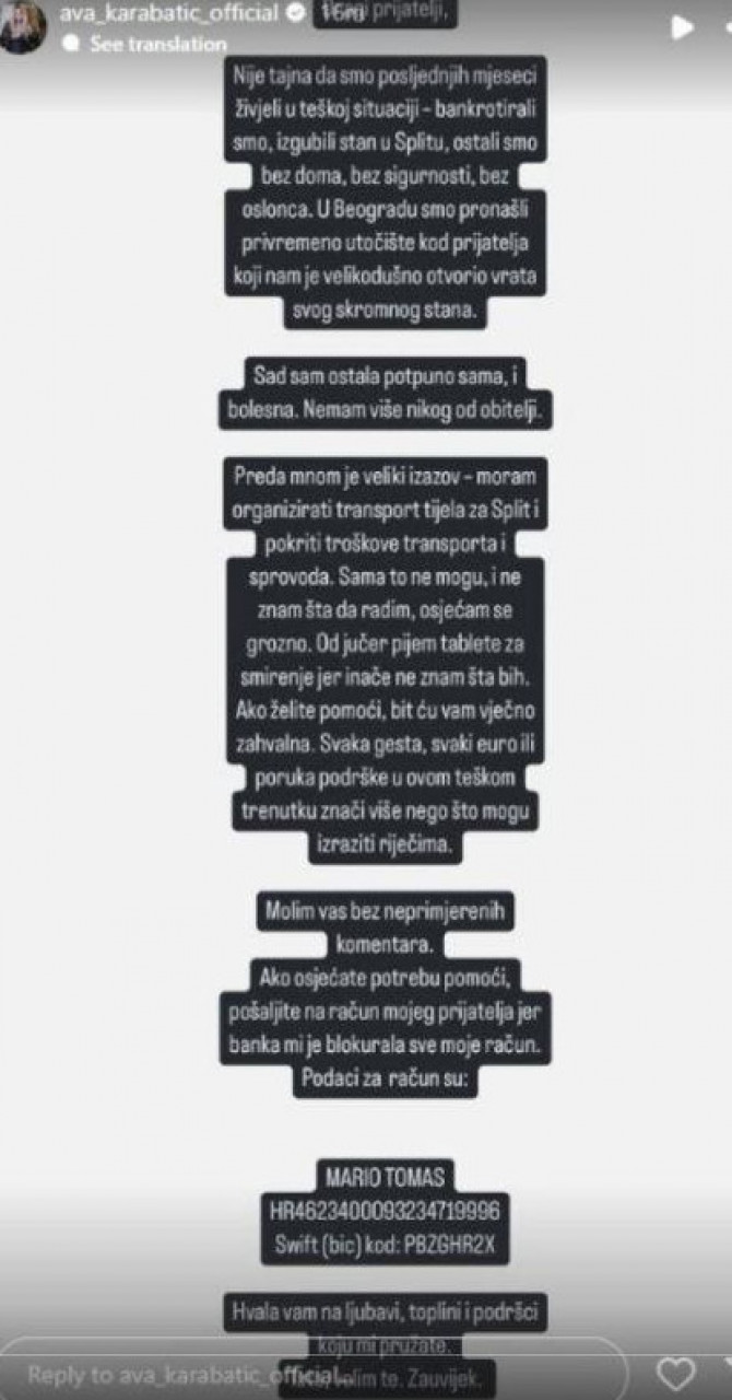 "Није тајна да смо последњих месеци живели у тешкој ситуацији - банкротирали смо, изгубили стан у Сплиту, остали смо без дома, без сигурности, без ослонца. У Београду смо пронашли привремено уточиште код пријатеља који нам је великодушно отворио врата свог скромног стана. Сад сам остала потпуно сама, и болесна. Немам више никог од породице", написала је Ава на Инстаграму, па додала: