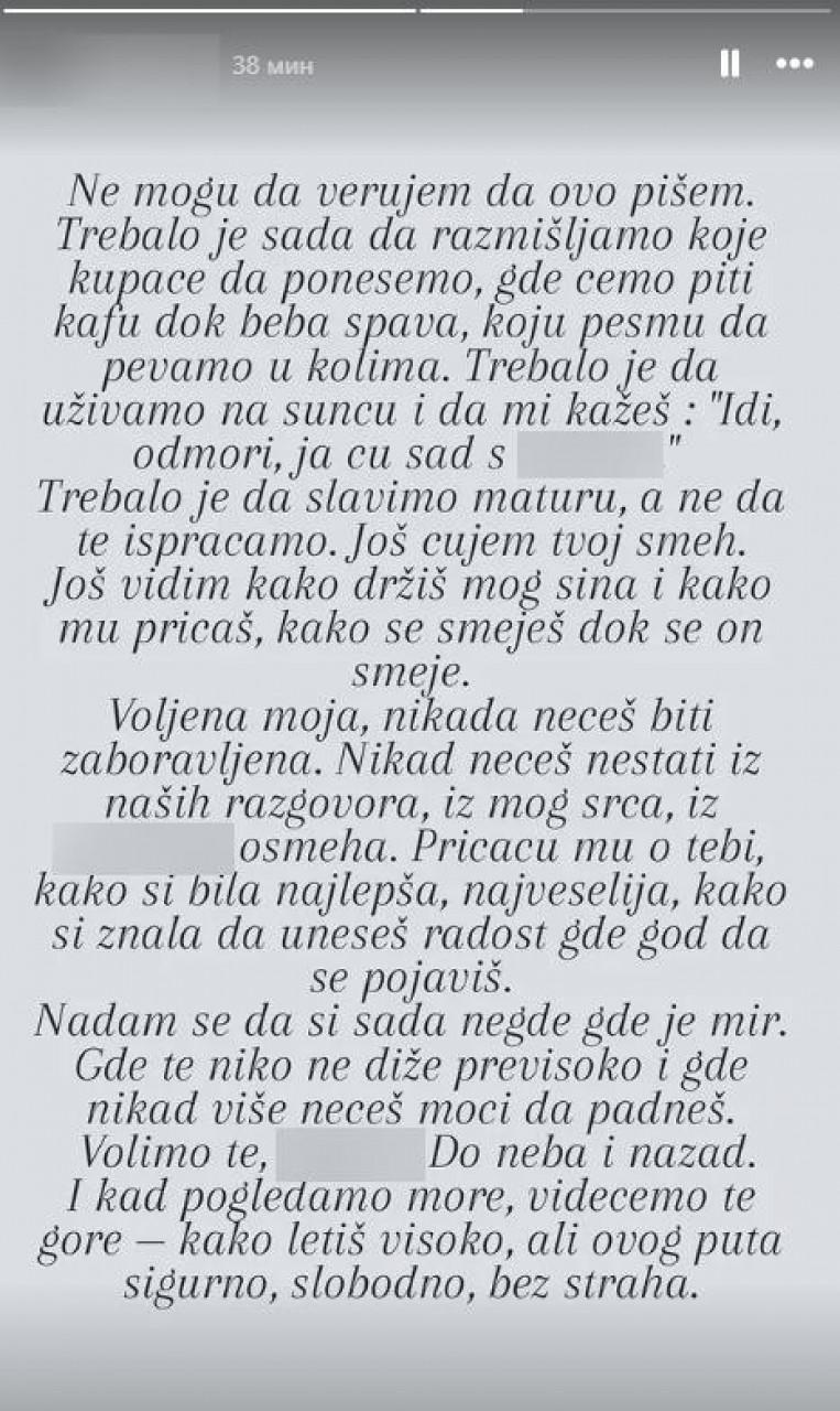 - Никад нећеш нестати из наших разговора, из мог срца, из осмеха мог сина. Причаћу му о теби, како си била најлепша, највеселија, како си знала да унесеш радост где год да се појавиш. Надам се да си сада негде где је мир. Где те нико не диже превисоко и где никад више нећеш моћи да паднеш. Волимо те, до неба и назад. И кад погледамо море, видећемо те горе - како летиш високо, али овог пута сигурно, слободно, без страха - написала је рођака.