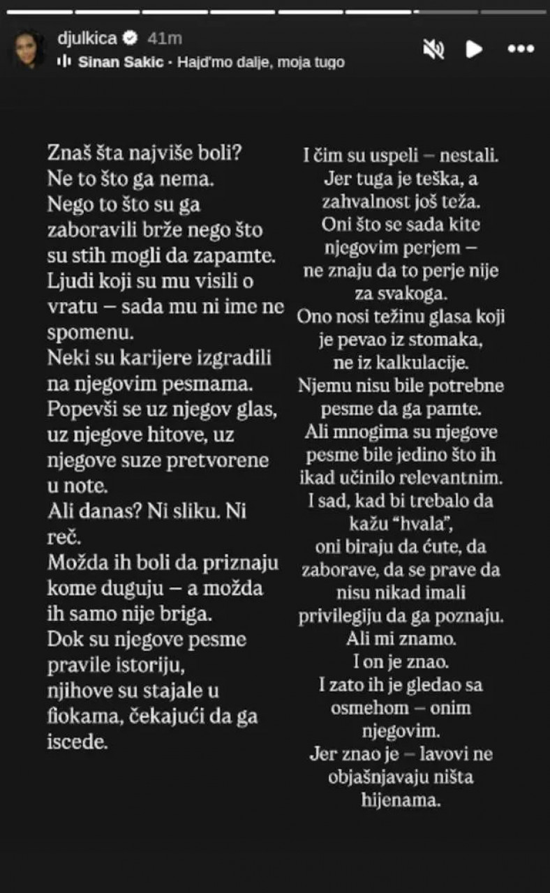 - Знаш шта највише боли? Не то што га нема, него то што су га заборавили брже него што су стих могли да запамте. Људи који су му висили о врату, сада му ни име не спомену. Неки су каријере изградили на његовим песмама. Попевши се уз његов глас, уз његове хитове, уз његове сузе претворене у ноте. Али данас – ни слику. Ни реч. Можда их боли да признају коме дугују, а можда их само није брига. Док су његове песме правиле историју, њихове су стајале у фиокама, чекајући да га исцеде. И чим су успели – нестали су. Јер туга је тешка, а захвалност још тежа. Они што се сада ките његовим перјем не знају да то перје није за свакога. Оно носи тежину гласа који је певао из стомака, не из калкулације - написала је она, након чега је наставила: