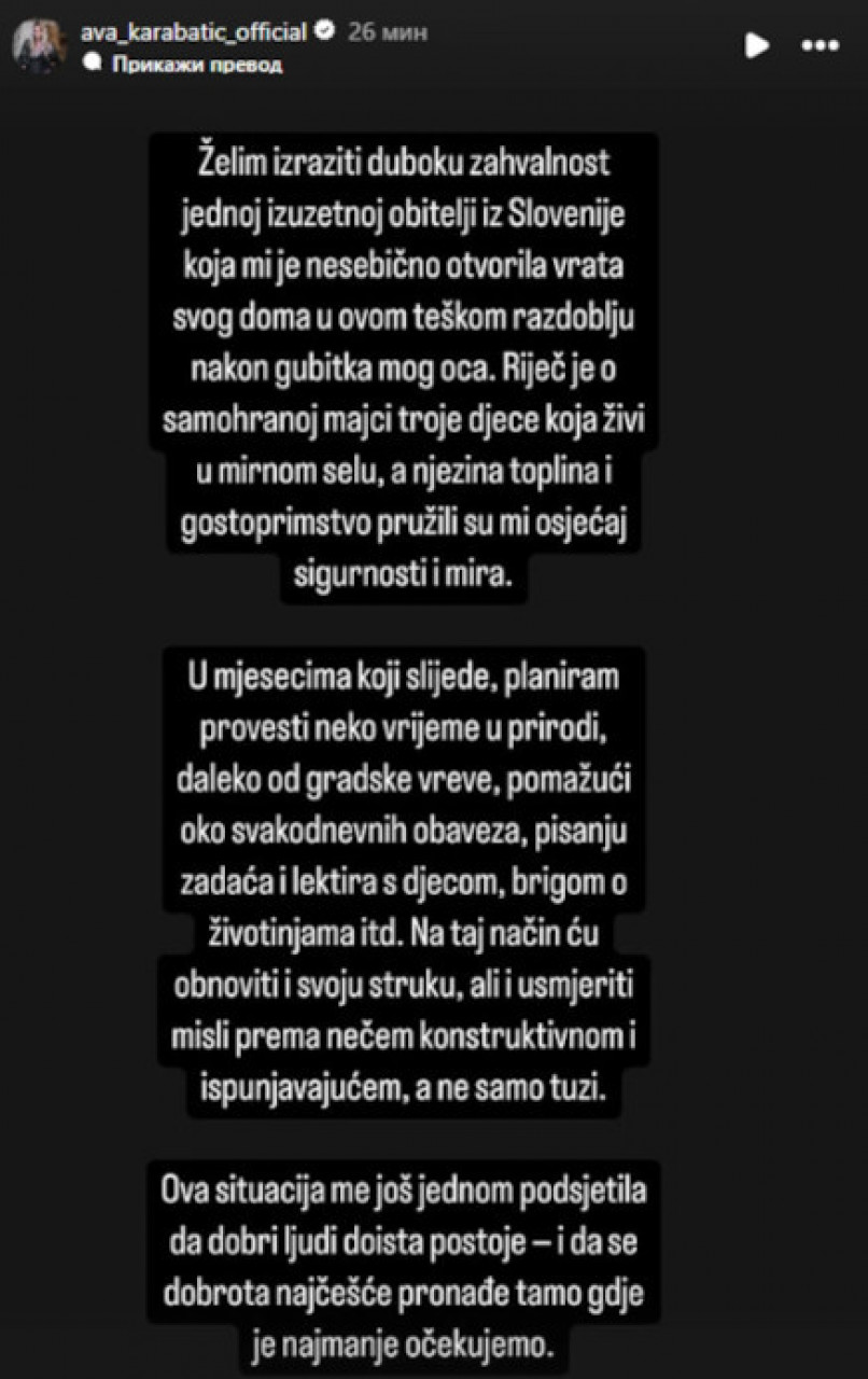 - Желим да изразим велику захвалност једној изузетној породици из Словеније, која ми је несебично отворила врата свог дома у овом тешком раздобљу након губитка мог оца. Реч је о самохраној мајци троје деце, која живи у мирном селу, а њена топлина и гостопримство пружили су ми осећај сигурности и мира...- почела је она и додала: