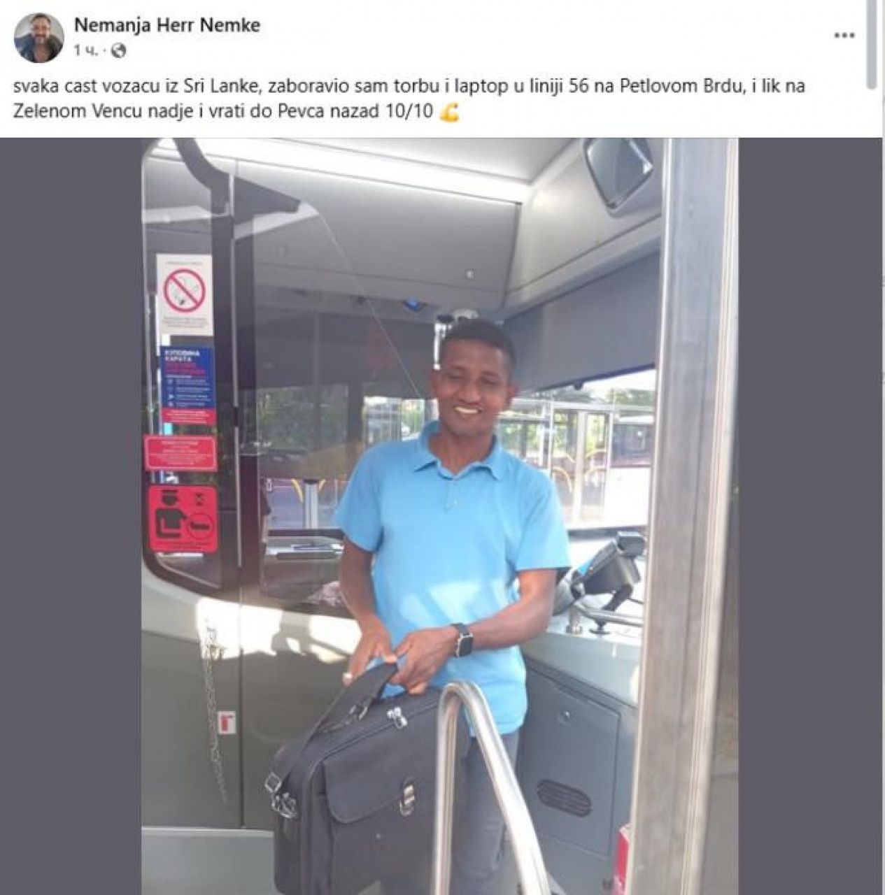 - Свака част возачу из Шри Ланке, заборавио сам торбу и лаптоп у линији 56 на Петловом Брду, и лик на Зеленом венцу нађе и врати до Певца назад 10/10 - писало је у објави испод које су се низале реакције:
