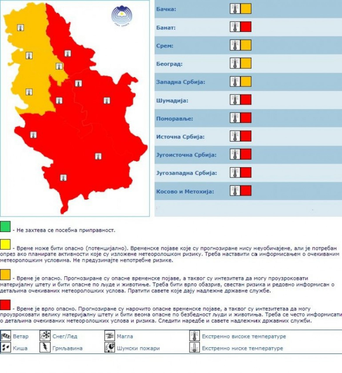 Данас се на подручју Србије очекује веома топло време са максималном температуром од 35 до 43 степени, услед чега постоји повећана опасност од иницирања и ширења пожара на отвореном.