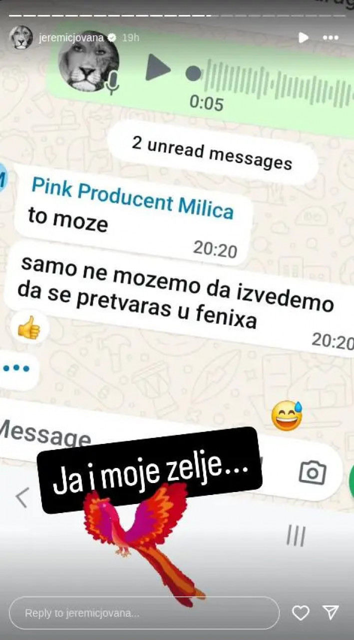 Јована је путем свог профила на социјалној мрежи Инстаграм, поделила исечак преписке са женом која јој је меморисана у контактима под именом "Пинк Продуцент Милица".
