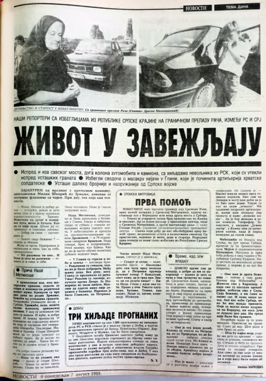 - Био је 6. август 1995. године. У наручју мајке бежала је од "Олује". Врео дан. Танка линија између живота и смрти испред старог моста на Сремској Рачи. Примамо вест: избеглице из Крајине не могу у Србију. Вест се ширила као зараза. Људи изнемогли на дугом путу без хране, воде. Без наде у повратак, падали су од очаја. Напред им не дају, назад немају куд - писале су Новости.