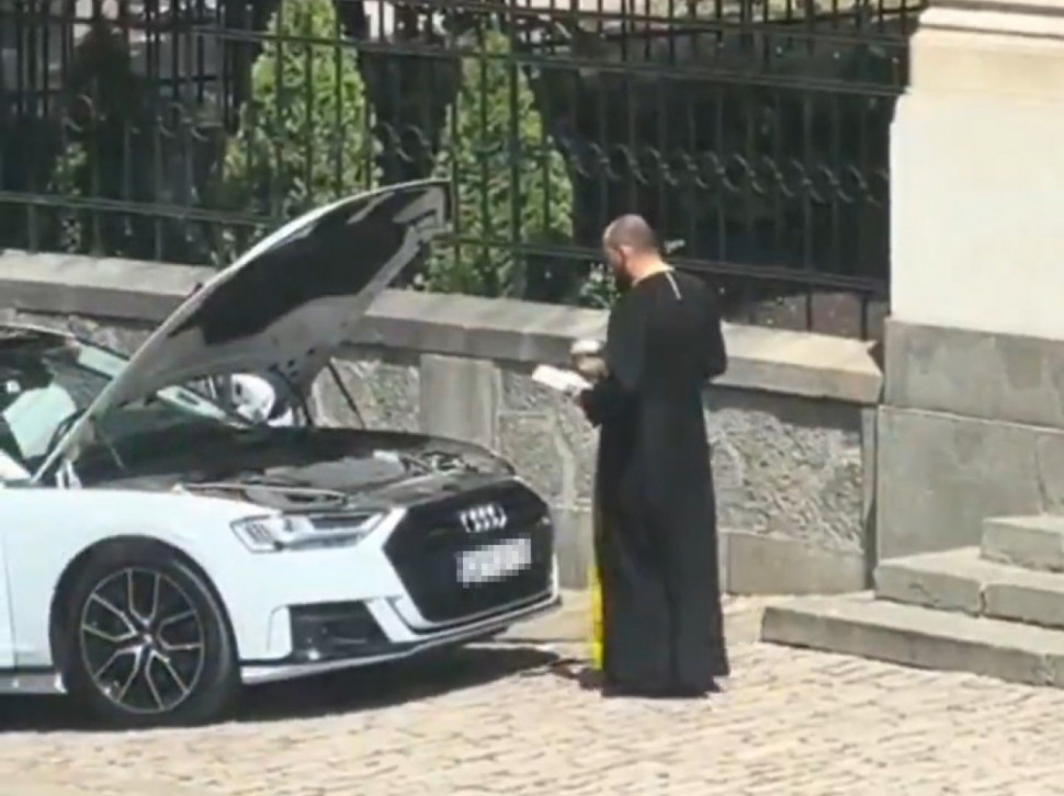 У првом плану је свештеник који стоји испред аудија са подигнутом хаубом, а сцена је заинтригирала и насмејала бројне гледаоце у региону.