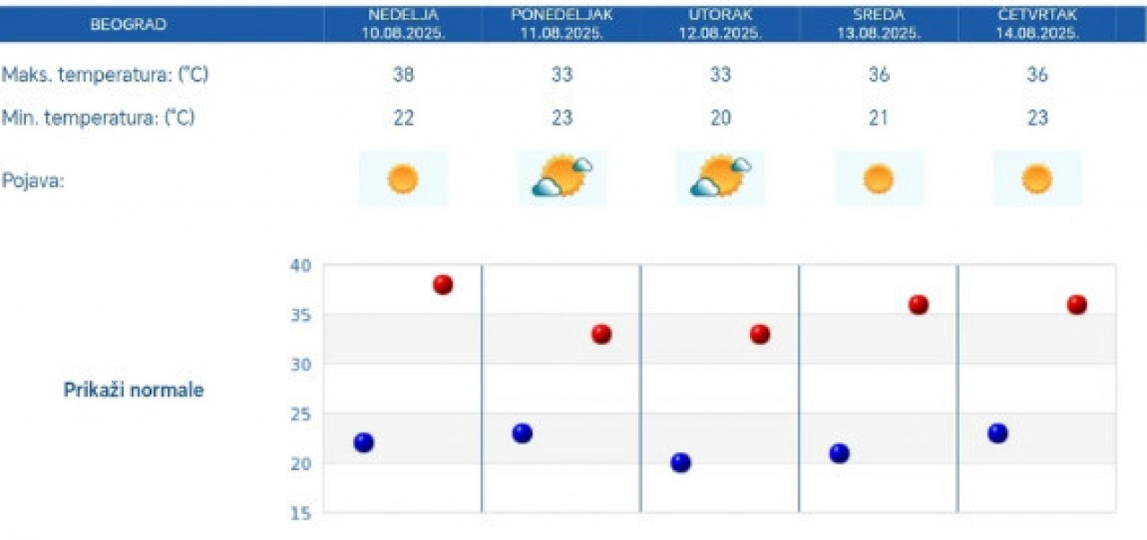 - Од 13. до 17. августа биће претежно сунчано и веома топло - најавио је РХМЗ.