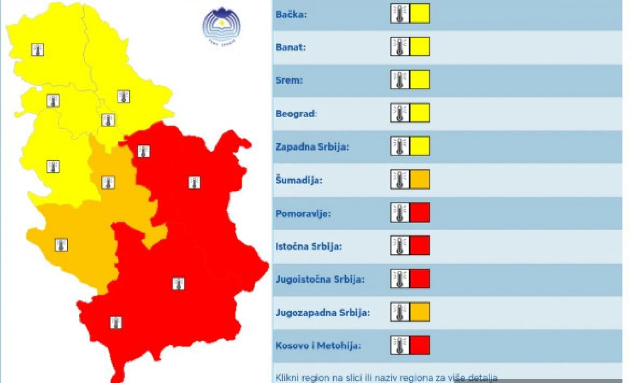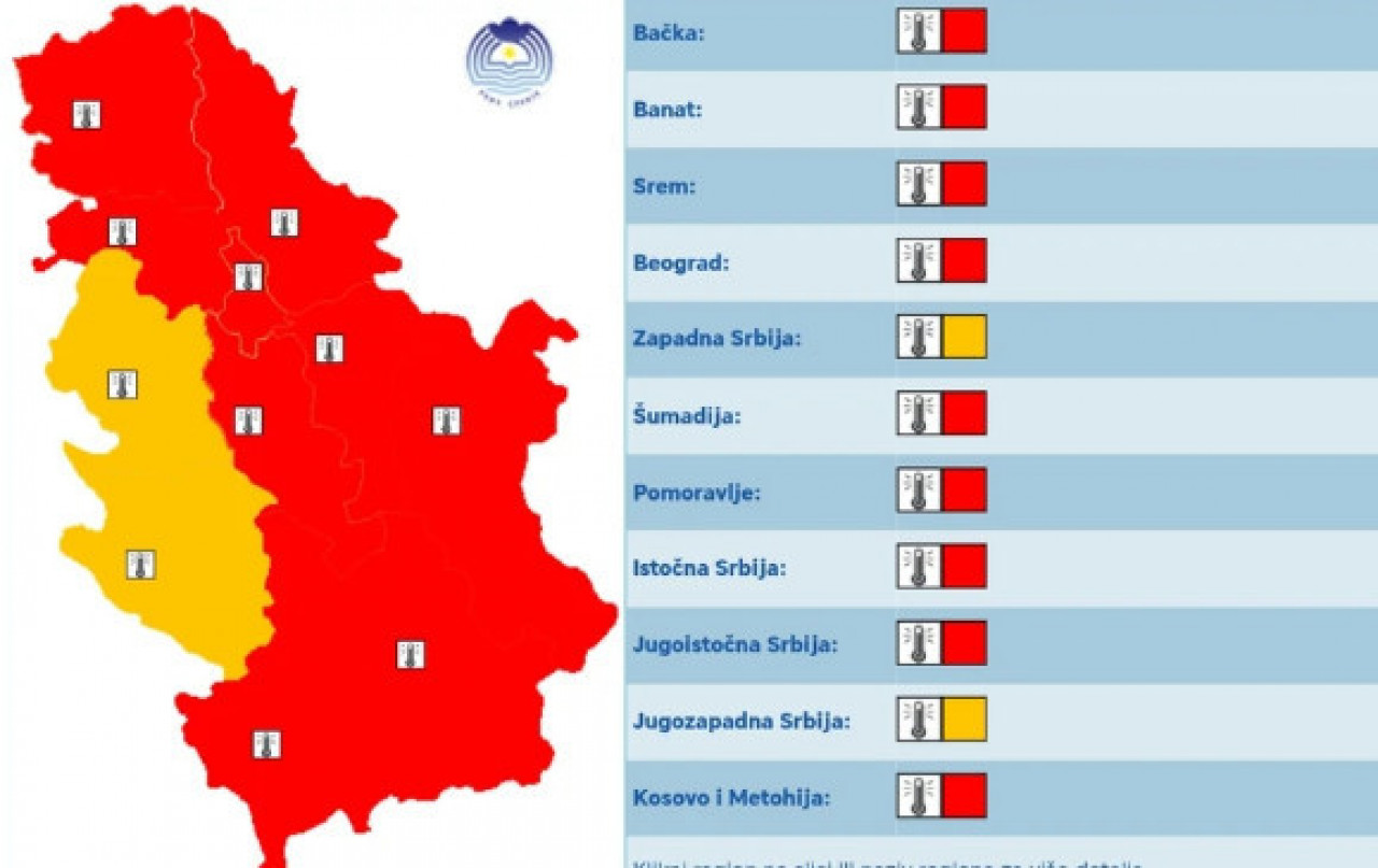 Данас на већем делу територије Србије биће упаљен црвени метеоаларм и ти због веома високих температура. Изузетак ће бити западна и југозападна Србије где ће на снази бити наранџасти метеоаларм.