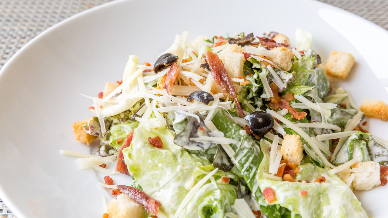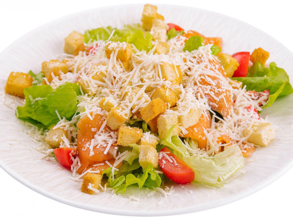 Зелену салату ситно исцепкајте, додајте мало маслиновог уља и ситно исецкан бели лук. Пилетину испеците у рерни или испржите у тигању, па исецкајте на мање комаде и додајте у зелену салату. Полијте лимуновим соком, ворчестер сосом, мајонезом, посолите по укусу. Додајте крутоне, измешајте и поспите пармезаном.