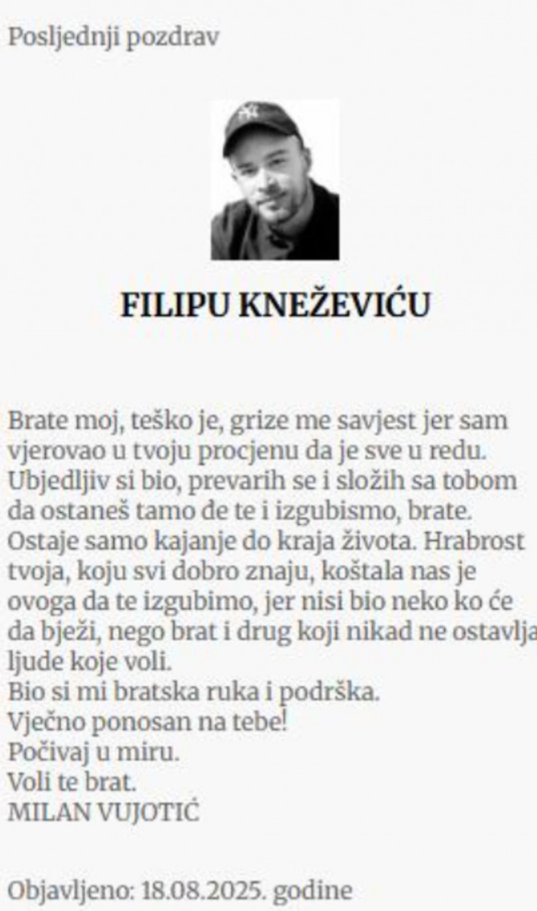 - Брате мој, тешко је, гризе ме савест јер сам веровао у твоју процену да је све у реду. Убедљив си био, преварих се и сложих са тобом да останеш тамо где те и изгубисмо, брате. Остаје само кајање до краја живота. Храброст твоја, коју сви добро знају, коштала нас је овога да те изгубимо, јер ниси био неко ко ће да бежи, него брат и друг који никад не оставља људе које воли. Био си ми братска рука и подршка. Вечно поносан на тебе! Почивај у миру. Воли те брат - написао је Милан Вујотић, за кога сматрају да је десна Звицерова рука.