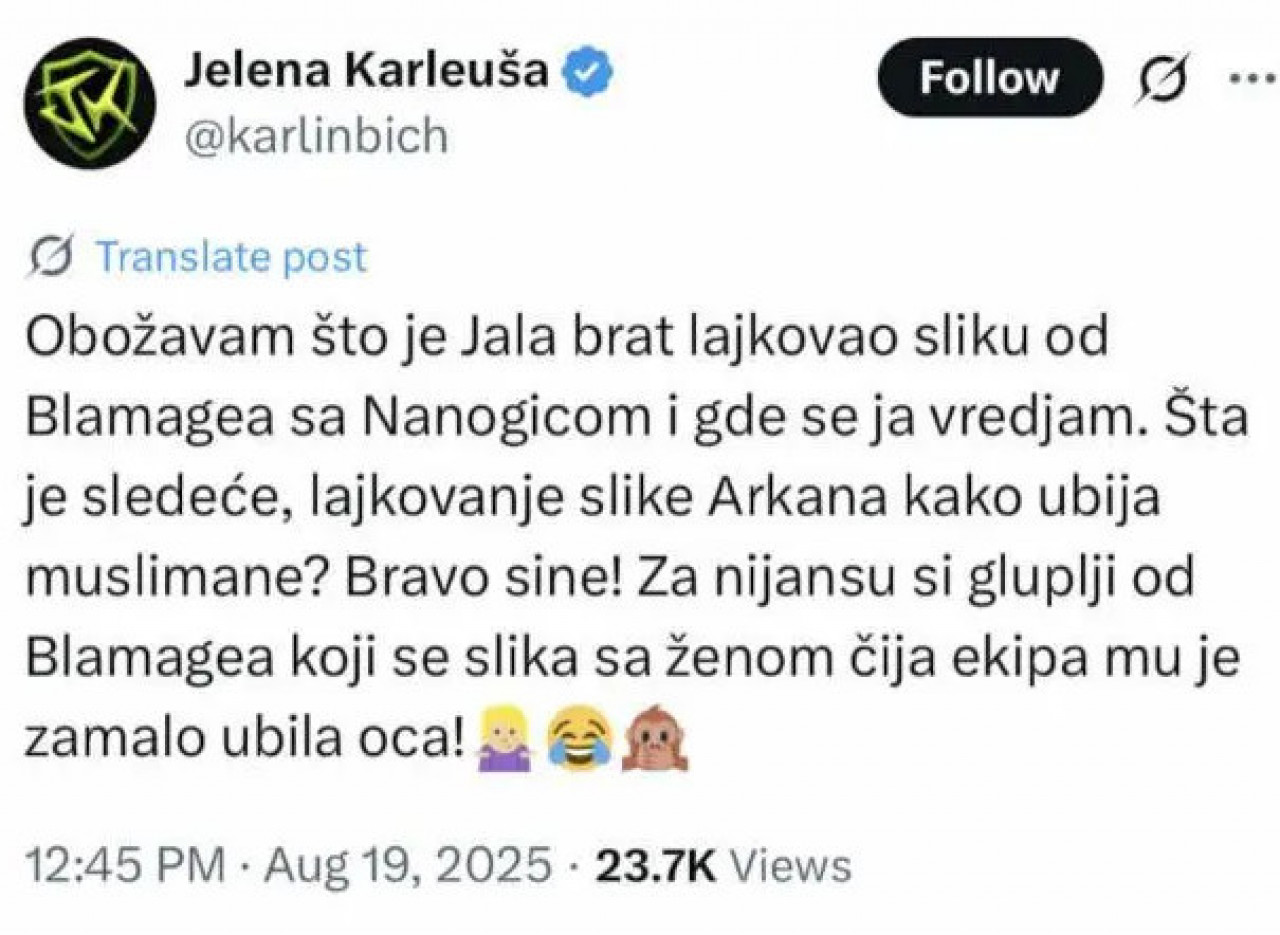 - Обожавам што је Јала брат лајковао слику од Бламагеа са Наногицом и где се ја вређам. Шта је следеће, лајковање слике Аркана како убија муслимане? Браво сине! За нијансу си глупљи од Бламагеа који се слика са женом чија екипа му је замало убила оца! - написала је она.