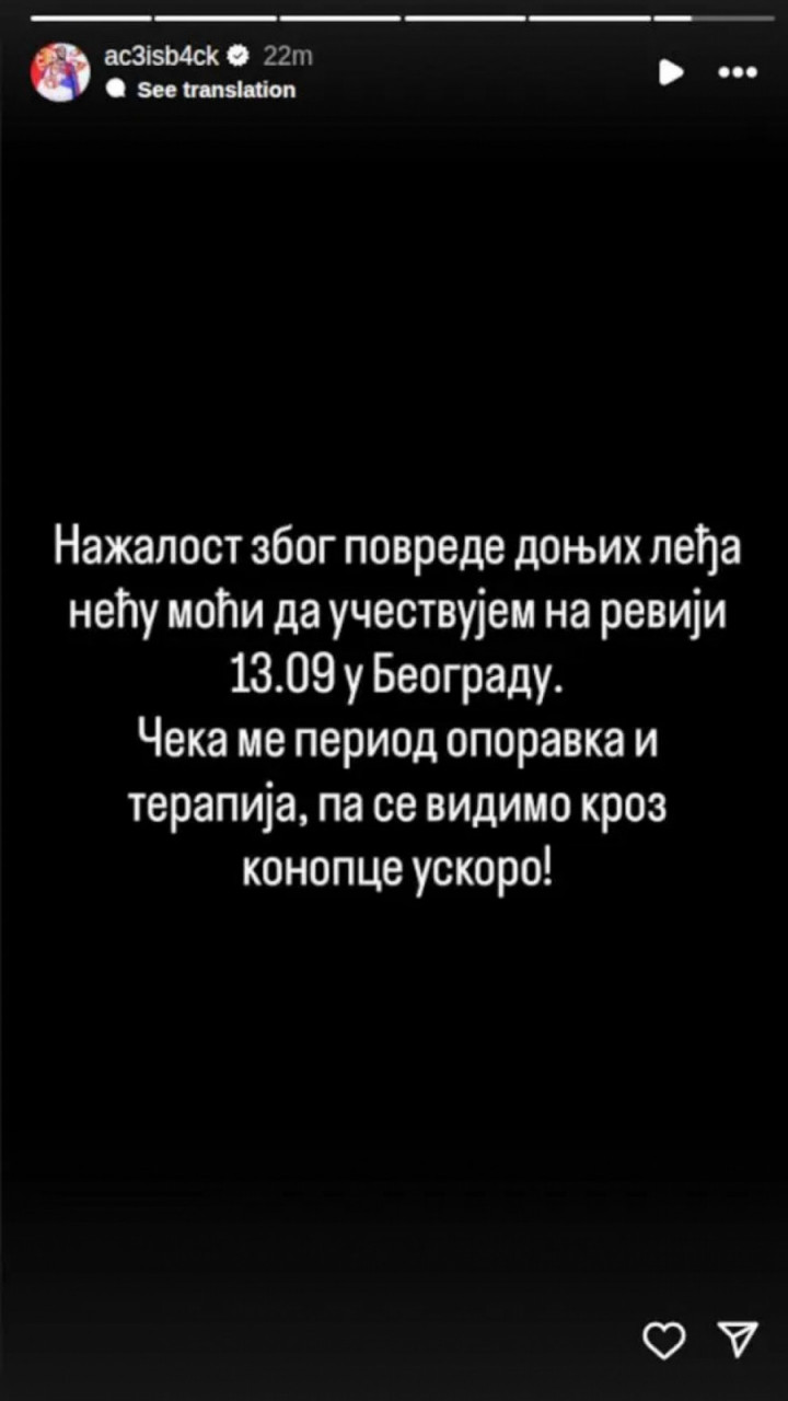 - Нажалост, због повреде доњих леђа нећу моћи да учествујем на ревији 13.09. у Београду. Чека ме период опоравка и терапија, па се видимо кроз конопце ускоро! - објаснио је Вељко Ражнатовић на Инстаграму.
