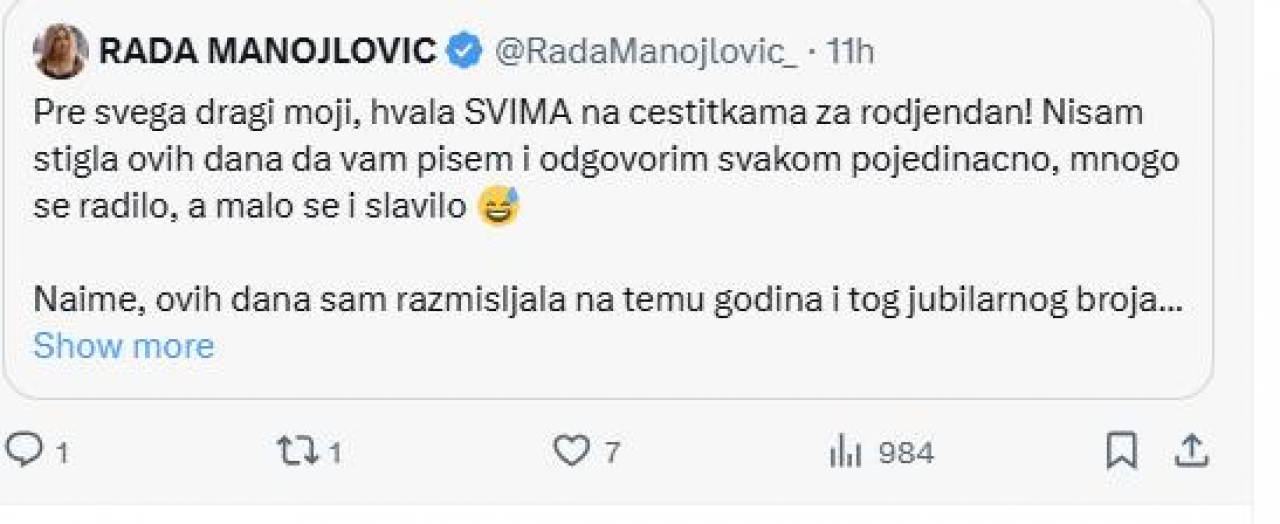 Ето, то су нека моја размисљања - написала је Рада на свом "X" налогу.