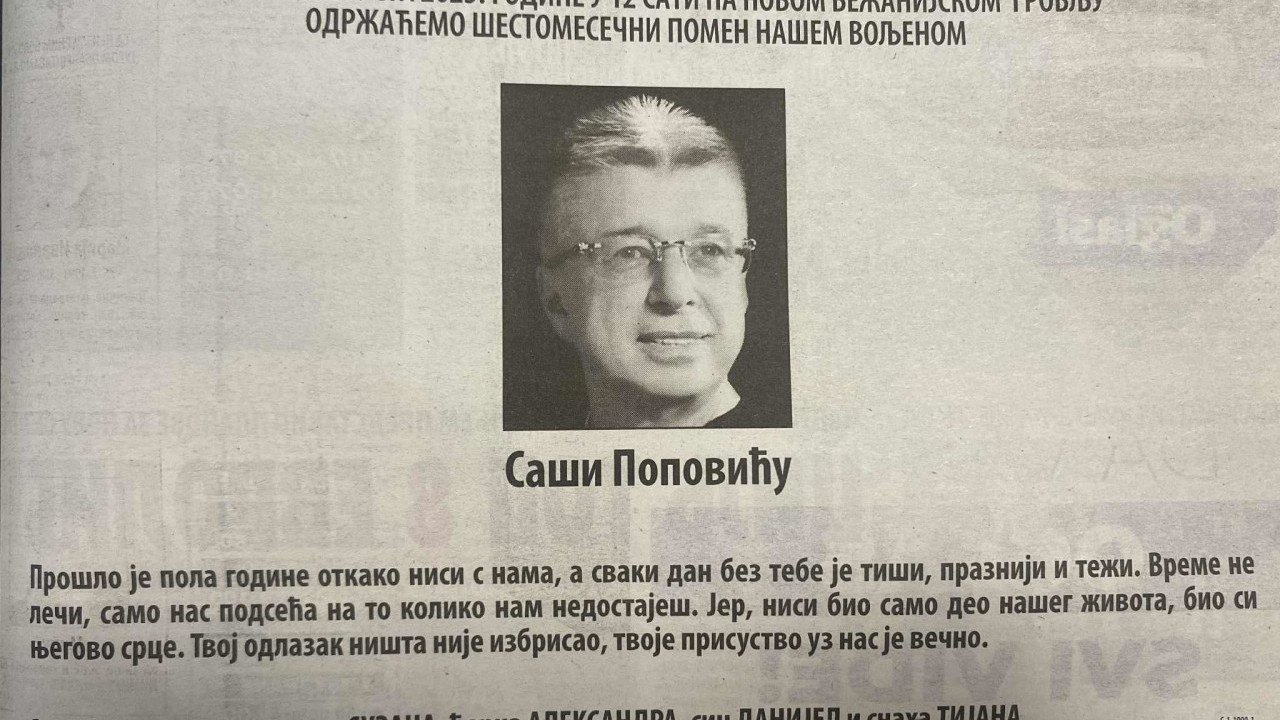 - Прошло је пола године откако ниси с нама, а сваки дан без тебе је тиши, празнији и тежи. Време не лечи, само нас подсећа на то колико нам недостајеш. Јер, ниси био само део нашег живота, био си његово срце. Твој одлазак ништа није избрисао , твоје присуство уз нас је вечно. Заувек неутешни: супруга Сузана, ћерка Александра, син Данијел и снаха Тијана - пише у читуљи.