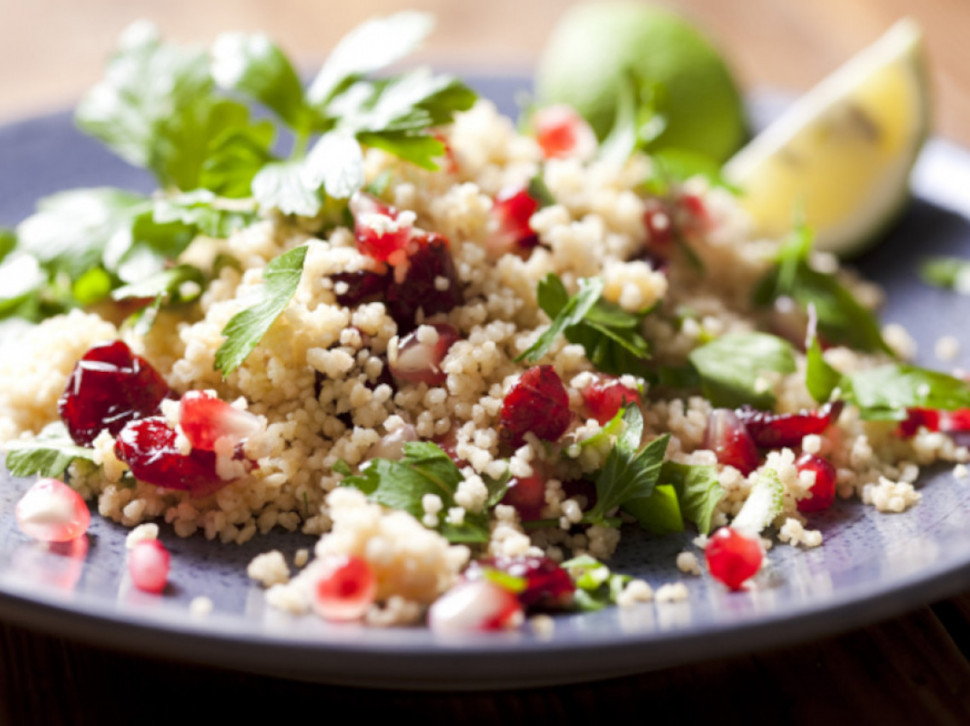 Воду посолите и ставите да проври, па прелијте кускус. Поклопите и оставите да стоји пет минута. Додајте маслиново уље, измешајте. Додајте чери пресечен напола, краставац и паприку исечене на коцкице. Прелив: Помешајте маслиново уље, лимунов сок, шећер, со и бибер по укусу. Сипајте прелив преко кускуса с поврћем и измешајте. Служите хладно.