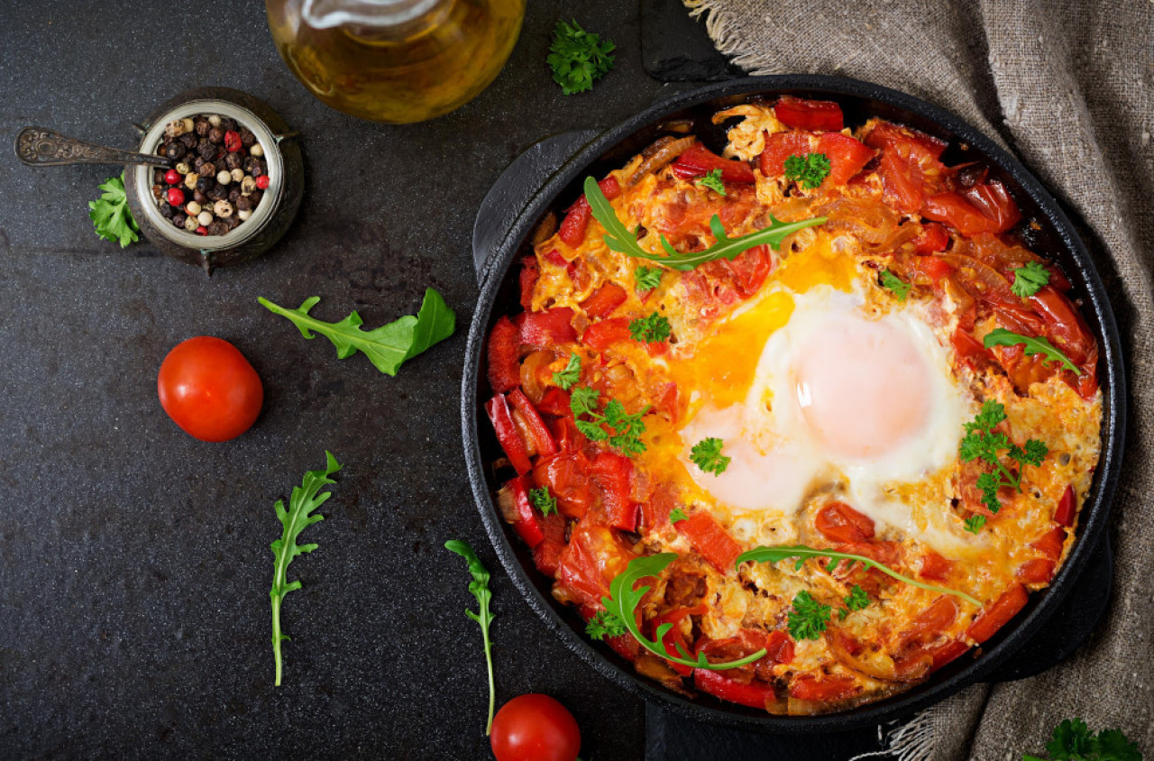 Исеците лук и паприку, пропржите на уљу док не омекшају. Додајте парадајзе и зачине, кувајте док сос не постане густ. Направите мала удубљења и разбијте јаја у њих. Покријте и крчкајте док јаја не буду готова. Послужите топло с хлебом.