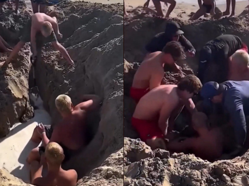 Ужаснути сведоци посматрали су како одрасли покушавају да извуку дечаке из песка, пре него што их снажни таласи потпуно заробе. Снимак приказује троје одраслих који копају рукама и лопатама, како би извукли малишане.