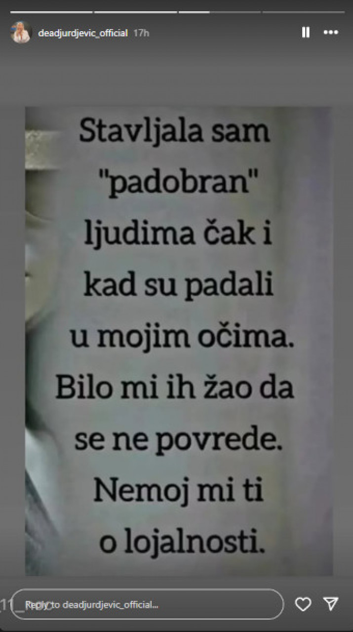 - Стављала сам падобран људима чак и када су падали у мојим очима. Био ми их је жао да се не повреде. Немој ми ти о лојалности - гласио је цитат који је поделила.