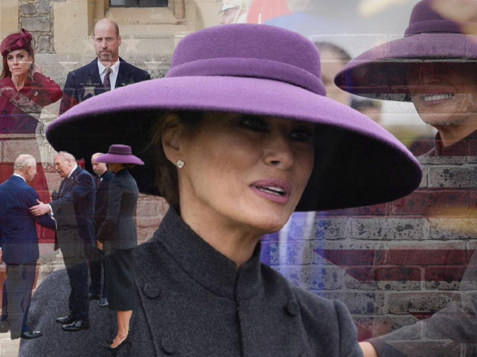 Током првог дана државне посете Винџору, Меланија се поново одлучила за драматичан модни детаљ, широк љубичасти шешир који јој је готово заклањао поглед. Комбиновала га је са профињеним тамносивим Диор костимом, стварајући елеганцију у маниру холивудских дива.