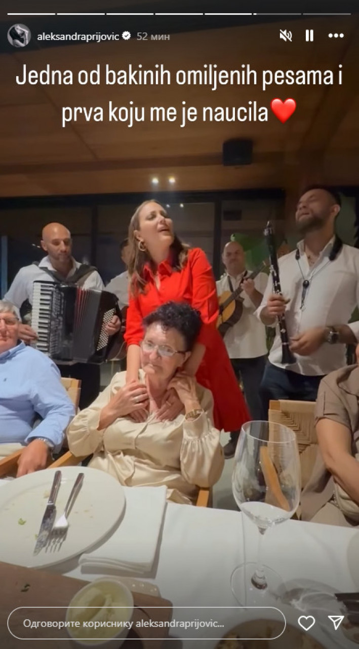 Пријовићка је објавила видео снимак на коме пева за своју, али и за душу своје баке. Када је Прија пустила глас и запевала песму "Од извора два путића" све госте је разнежила, а посебно баку коју је у једном тренутку од свег срца грлила и љубила.