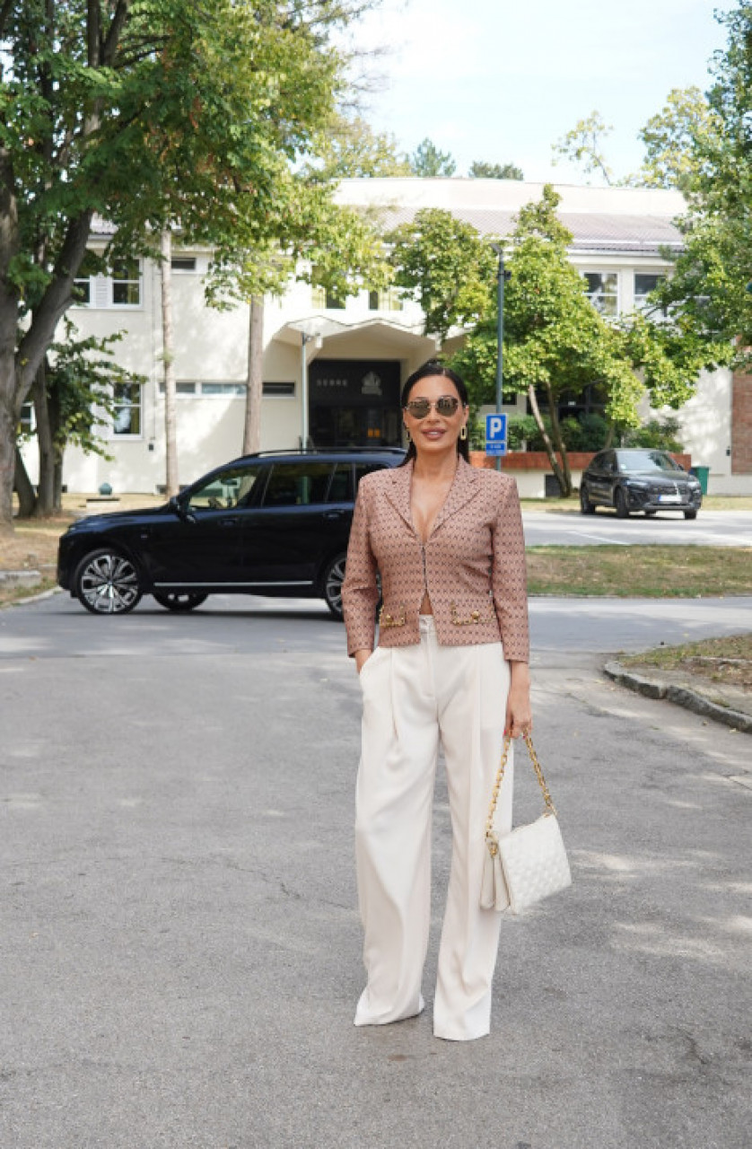 Певачица је решила да за нову емисију снимања "Звезде Гранда" обуче нешто сведенију варијанту - беле широке панталоне и сако са златним детаљима испод ког није носила брусхалтер, а који је савршено истакао њену фигуру.