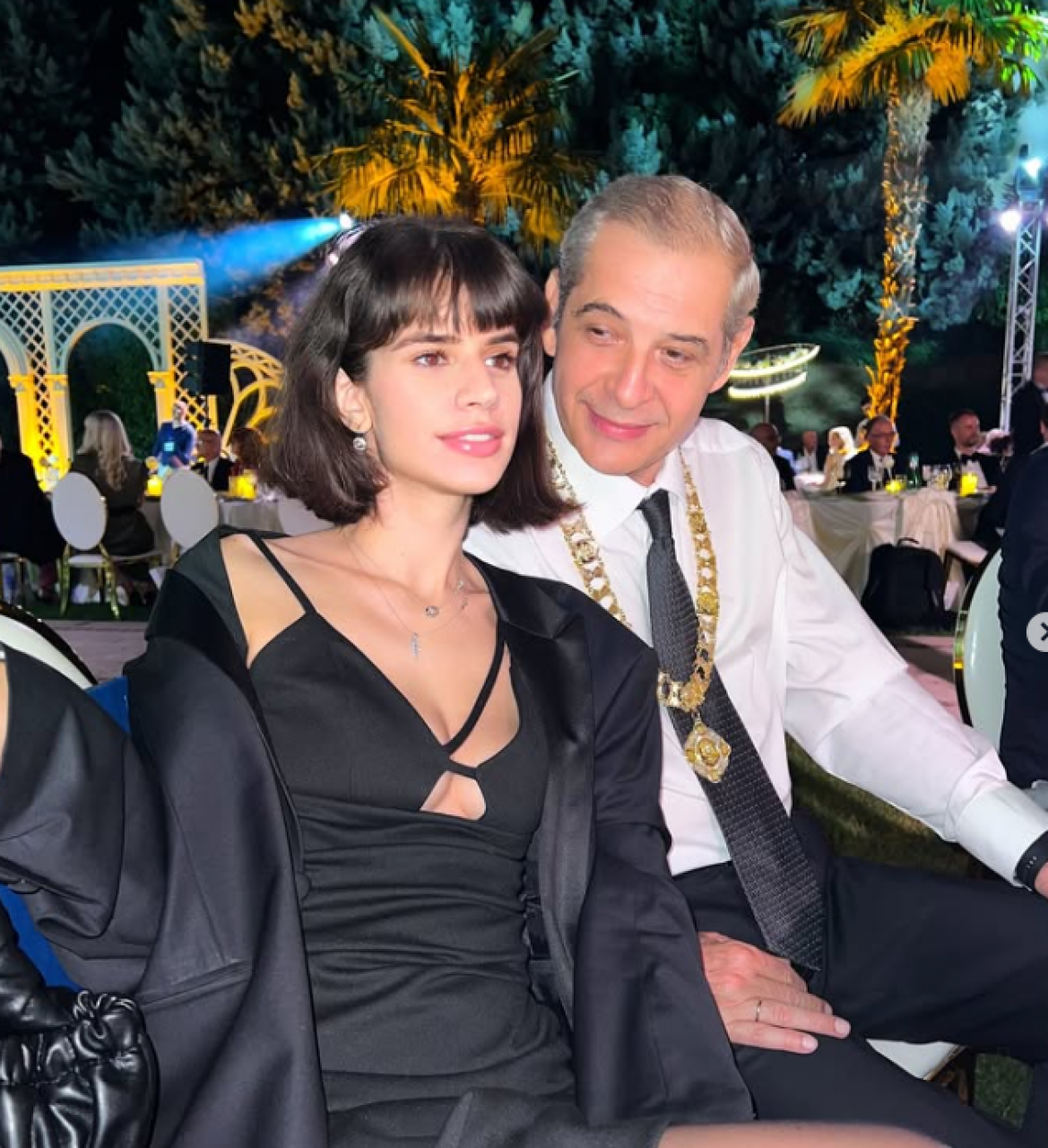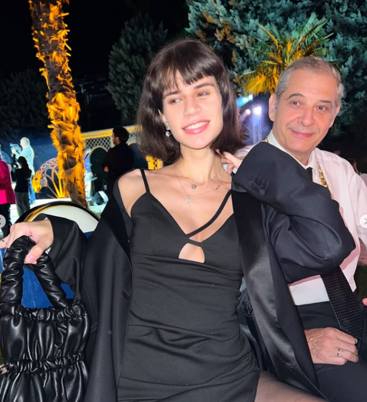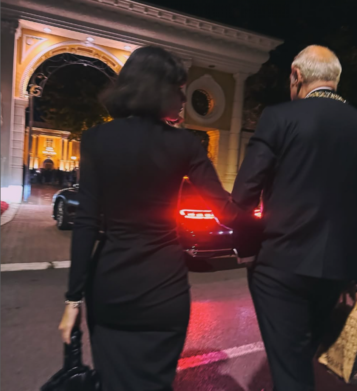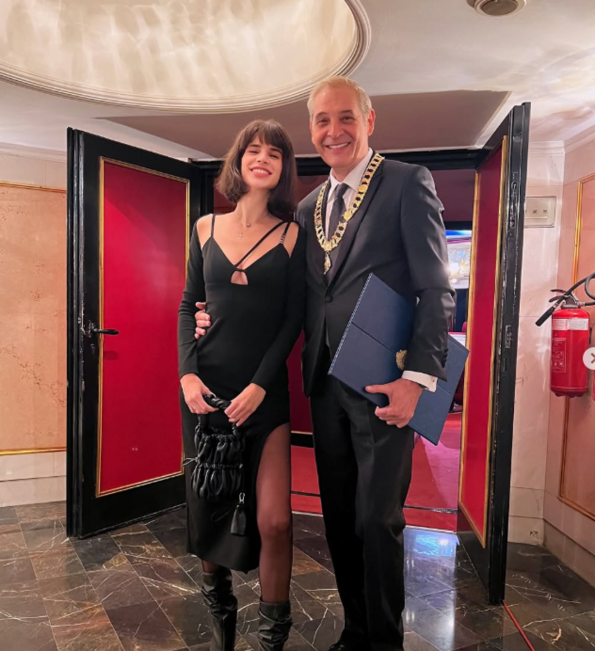 Она је била у црној хаљини са отвором на грудима, црним чарапама и уз све то је укомбиновала црни сако, док је глумац био у оделу.