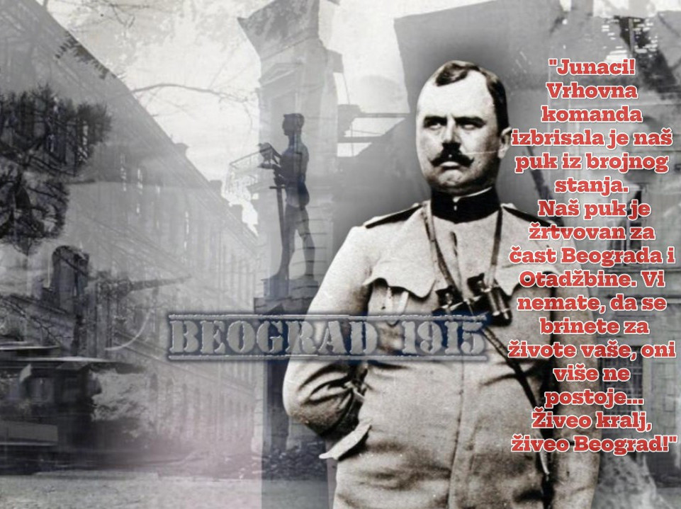 - Војници, Јунаци! Тачно у 15 часова непријатеља се има разбити вашим силним јуришом, разнети вашим бомбама и бајонетима. Образ Београда, наше престонице, има да буде светао. ВОЈНИЦИ! Јунаци! Врховна команда избрисала је наш пук из бројног стања. Наш пук је жртвован за част Београда и Отаџбине. Ви немате, дакле, да се бринете за животе ваше, они више не постоје. Зато, напред, у славу! За краља и отаџбину! Живео краљ, живео Београд!
