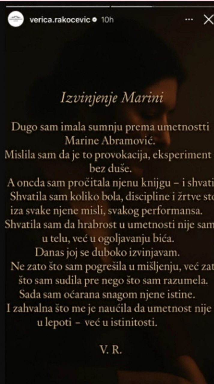 Схватила сам да храброст у уметности није само у телу, већ огољавању бића. Данас јој се дубоко извињавам. Не зато што сам погрешила у мишљењу, већ зато што сам судила пре него што сам разумела. Сада сам очарана снагом њене истине. И захвална сам што ме је научила да уметност није у лепоти - већ у интимности", поручила је Ракочевић.