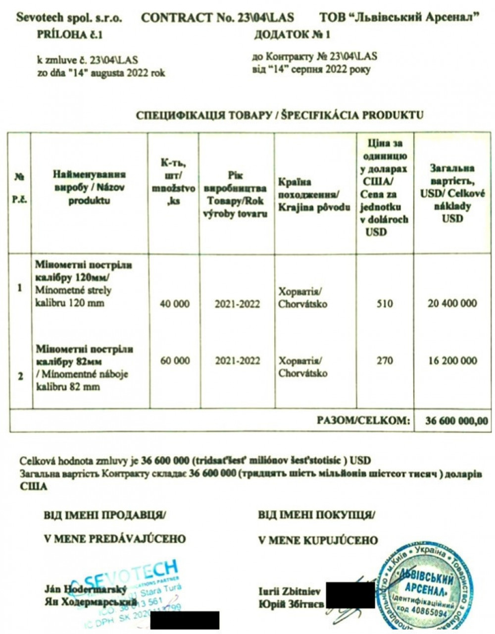 Журнал се позива на документацију која је објављена у украјинским медијима, али и на реакцију коју је тим поводом упутио директор "Sevotech-а" Јан Ходермарскy. Пишу да је "Sevotech" ангажовао фабрику из Хрватске која је на располагању имала гранате калибра 120 мм, али није била спремна да их испоручи пре него што буде уплаћено 50 одсто аванса.