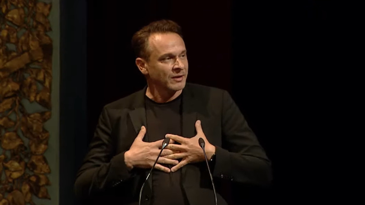 После говора Халидове унуке, глумца Емира Хаџихафизбеговића, Халидовог кума и певача Хариса Џиновића уследио је говор глумца Енеса Бешлагића: