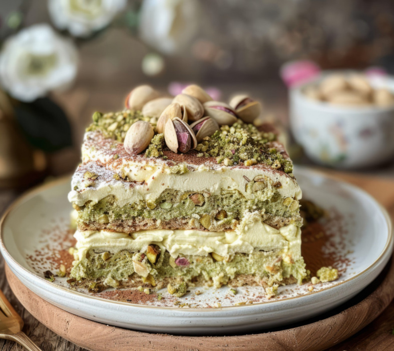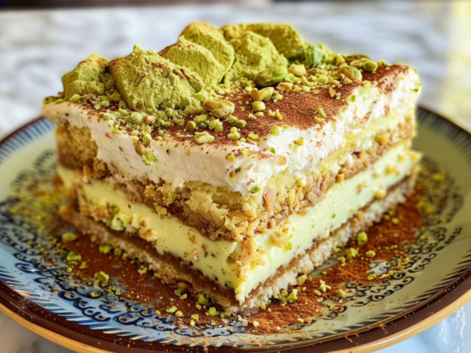 Припремљене пишкоте кратко умачите у кафу са пистаћ кремом и ређајте на дно посуде или чаша. Прекријте их слојем фила, па наставите наизменично да слажете пишкоте и крем. Завршите филом и поспите млевеним пистаћима.