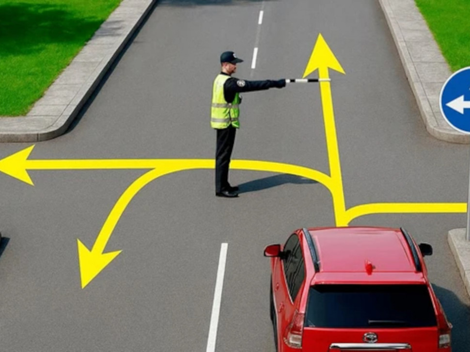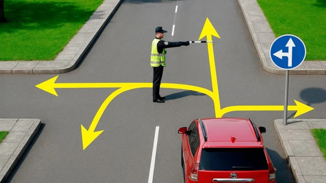 На слици се види аутомобил који стоји на улазу у раскрсницу и има знак за обавезно кретање право и лево, али ту је и саобраћајац. Питање које је постављено пред људе је куда аутомобил може да прође.