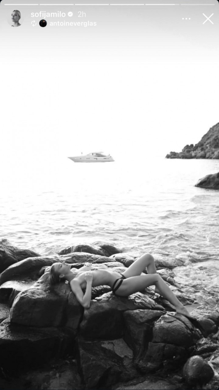 На фотографији Софија позира на стенама, потпуно природна, без шминке, али без горњег дела купаћег костима, док је груди прекрила само рукама.