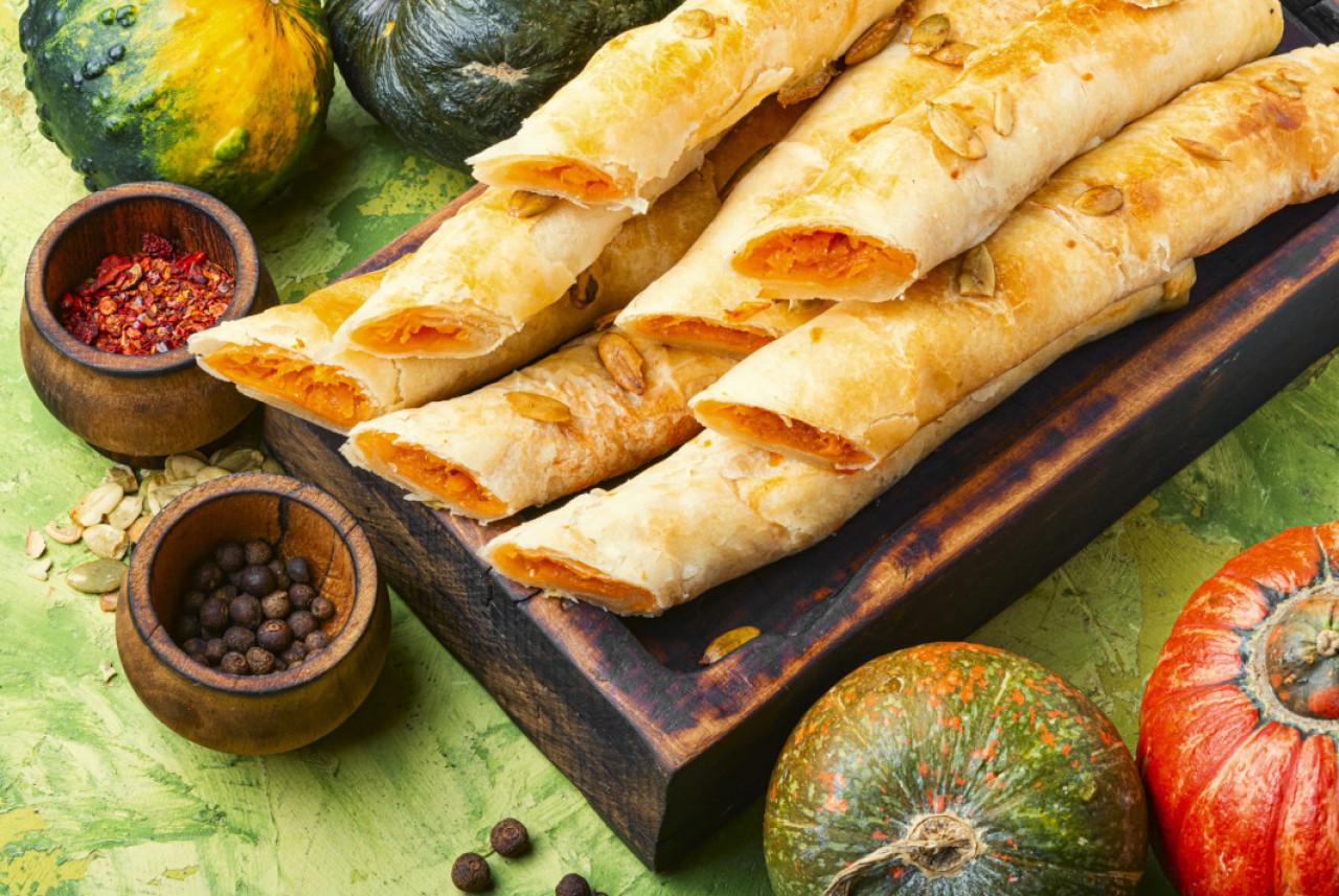 Рерну загрејте на 180 степени. Са бундеве уклоните коре и семенке, испеците је и изгњечите. Онда је помешајте са шећером, циметом, мускатним орашчићем, сувим воћем и орасима. Две коре премажите уљем па нанесите део фила и уролајте. Поређајте у плех обложен пек папиром. Поступак понављајте док не утрошите сав материјал. Затим премажите штрудле уљем и поспите семенкама бундеве. Пеците штрудле око 35 до 40 минута, у рерни загрејаној на 180 степени.