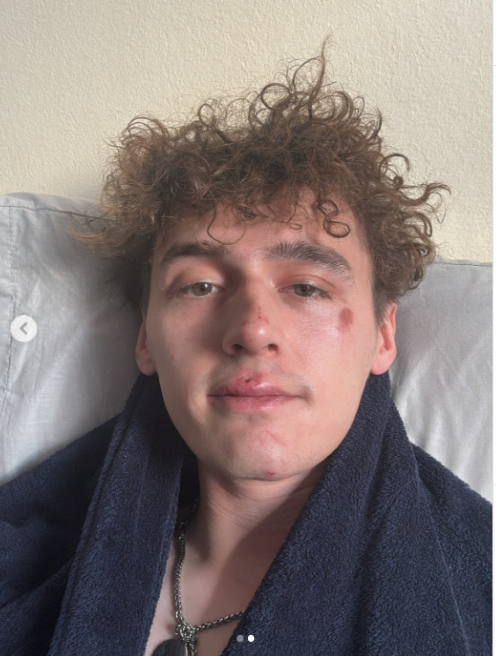 Камерон је објавио две фотографије на Инстаграму - на једној се види како лежи у кревету с видљивом модрицом испод ока, док друга приказује посекотине и подливе на његовом лицу.