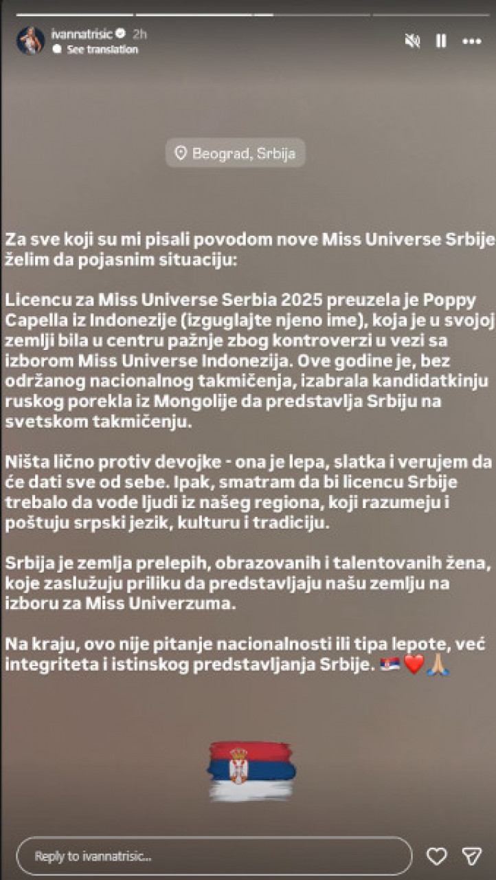 Тришићева је на крају поручила да лиценца за Мис Универзума Србија треба да буде у рукама људи који долазе из нашег региона и који искрено поштују Србију, њену културу и народ.