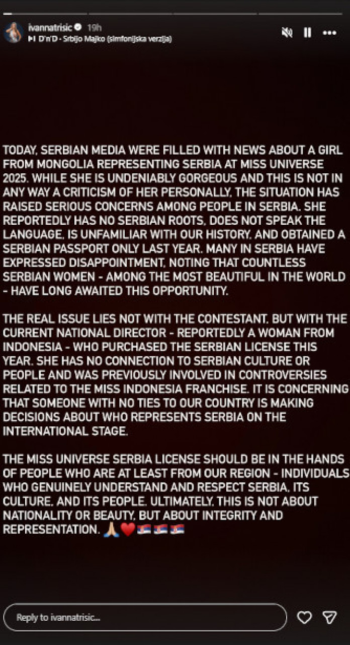 - Ово није питање националности или лепоте, већ интегритета и репрезентације - закључила је бивша мисица уз емотиконе српске заставе и срца.