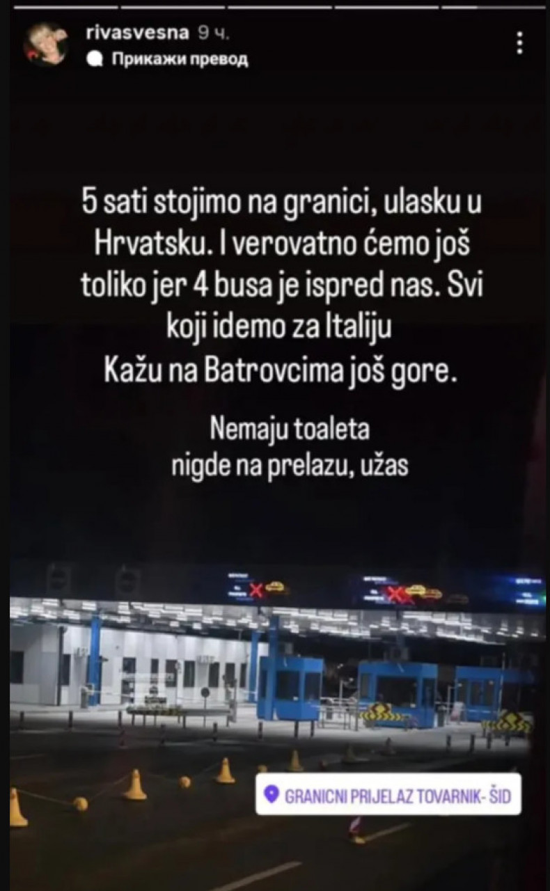 - Пет сати стојимо на граници, уласку у Хрватску. И вероватно ћемо још толико јер четири буса су испред нас. Сви који идемо за Италију. Кажу, на Батровцима је још горе. Немају тоалета нигде на прелазу, ужас, поручила је Весна уз фотографију са граничног прелаза.