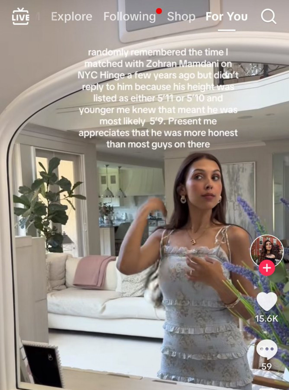 Снимак екрана са њеног сада избрисаног ТикТок профила подељен је на друштвеној мрежи X, а у њему је детаљно описала своје наводно искуство. Присeтила се како се пре неколико година спојила са Мамданијем на Хинге-у, али му није одговорила због његове наведене висине.