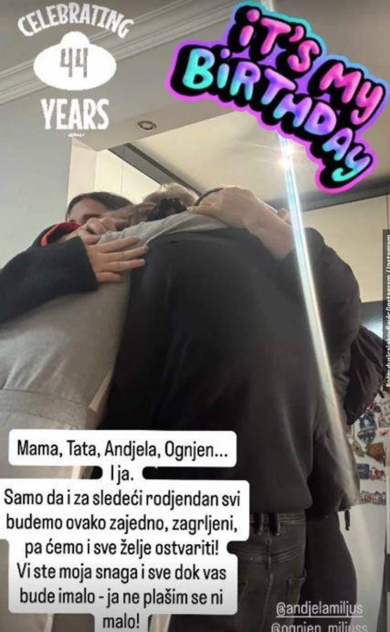 - Мама, тата, Анђела, Огњен и ја. Само да и за следећи рођендан сви будемо овако заједно, загрљени, па ћемо и све жеље остварити. Ви сте моја снага и све док вас буде имало, ја не плашим се ни мало - написала је Душица у опису.