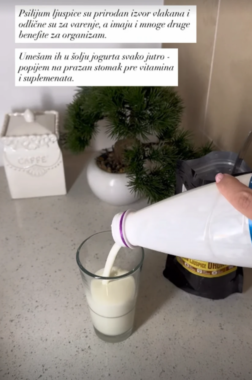 - Псилијум љуспице су природан извор влакана и одличне су за варање, а имају и многе друге бенефите за организам. Умешам их у шољу за јогурт свако јутро, попијем на празан стомак пре витамина и суплемената - написала је Мирка док је правила напитак.