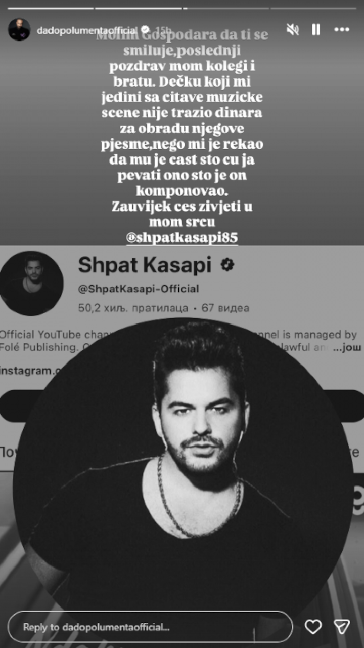 - Молим Господара да ти се смилује, последњи поздрав мом колеги и брату. Дечку који ми једини са читаве музичке сцене није тражио динара за обраду његове песме, него ми је рекао да му је част што ћу ја певати оно што је он компоновао. Заувек ћеш живети у мом срцу - речи су које је Дадо Полумента посветио покојном певачу.