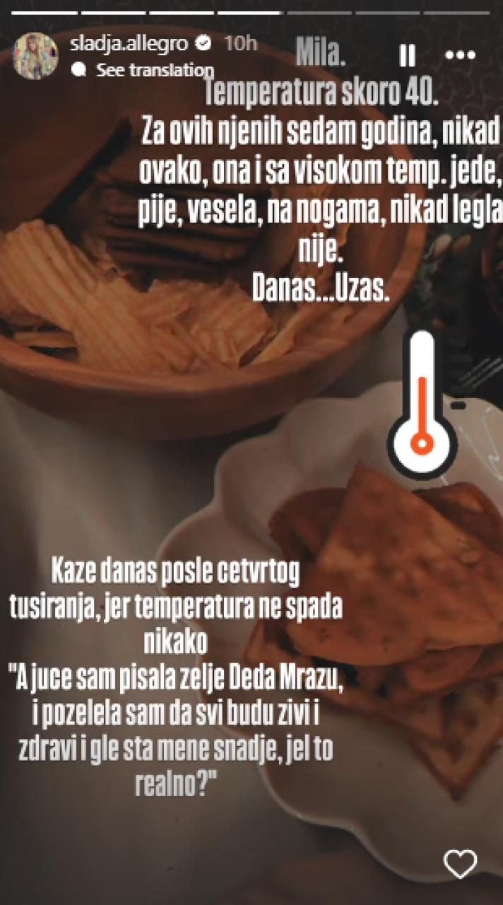- Температура скоро 40. За ових њених седам година, никад овако, она и са високом температуром једе, пије, весела је, на ногама, никад легла није. Данас.... Ужас - навела је Слађа Алегро.