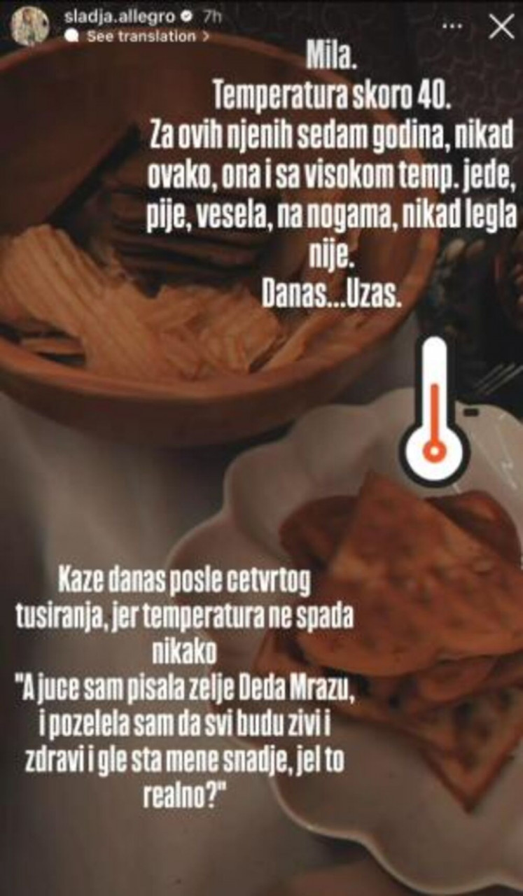 - Температура скоро 40. За ових њених седам година, никад овако, она и са високом температуром једе, пије, весела је, на ногама, никад легла није. Данас.... Ужас - навела је Слађа Алегро и додала: