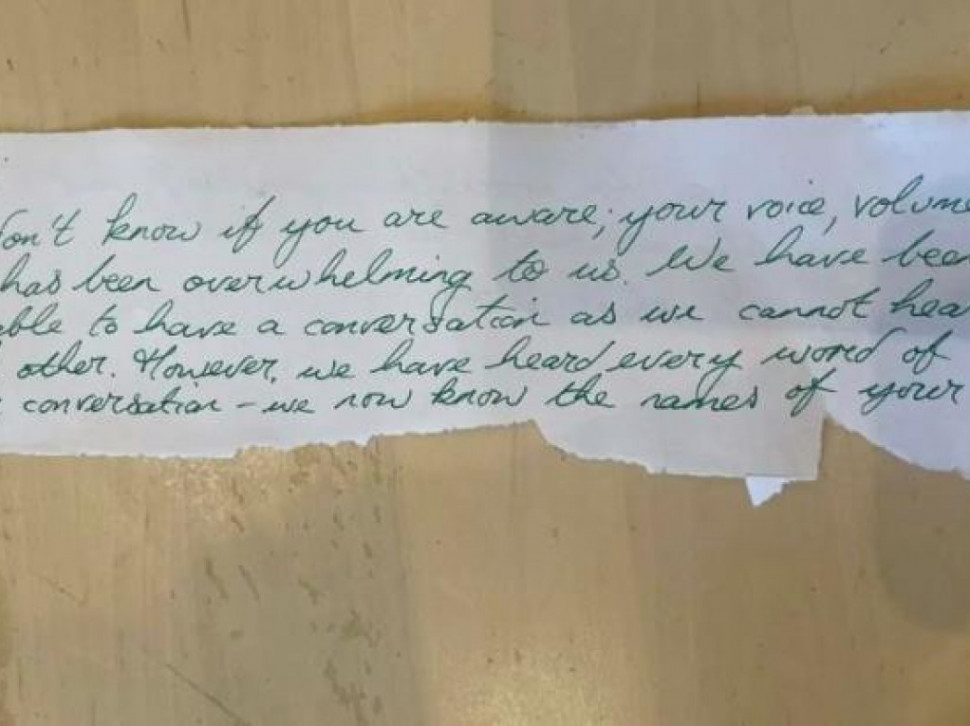 У поруци је писало: "Здраво, не знам да ли сте свесни, али говорите доста гласно. Нама је било превише - нисмо се могли чути док смо разговарали. Зато смо, нажалост, чули сваку реч вашег разговора - сада чак знамо и имена ваших мачака. Ово је простор који делите са другима, а ми смо због тога морали да одемо. Само нешто за размишљање."