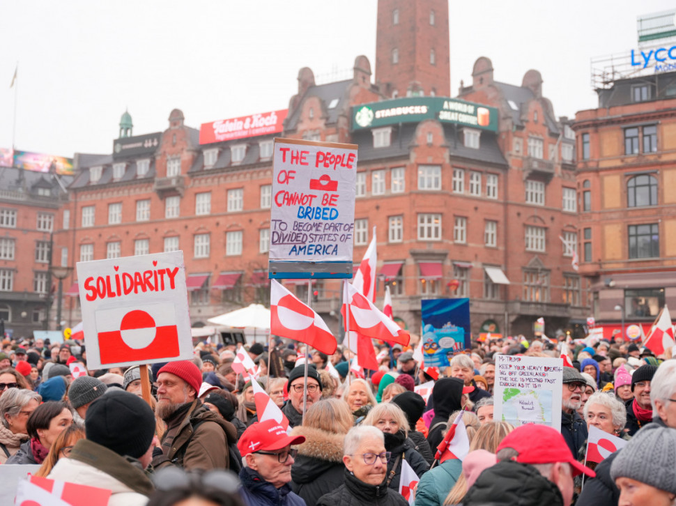 Учесници протеста, који су се окупили на Тргу градске куће у Копенхагену пре него што су кренули ка америчкој амбасади, скандирали су "Гренланд није на продају", а неки су држали транспаренте са слоганима попут "Даље руке од Гренланда" и црвено-беле заставе Гренланда.