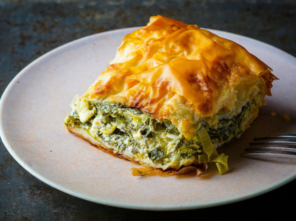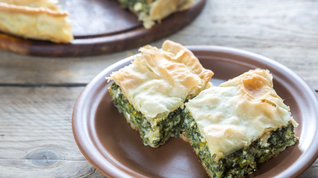 Лук ситно исецкајте и пропржите у уљу док не омекша, па додајте спанаћ и пропржите док не увене. Зачините сољу, бибером и мало мускатног орашчића. Развуците коре, премажите их уљем и ставите фил од спанаћа. Заролајте или сложите у тепсију и пеците док пита не добије златну кору. Послужите топло.